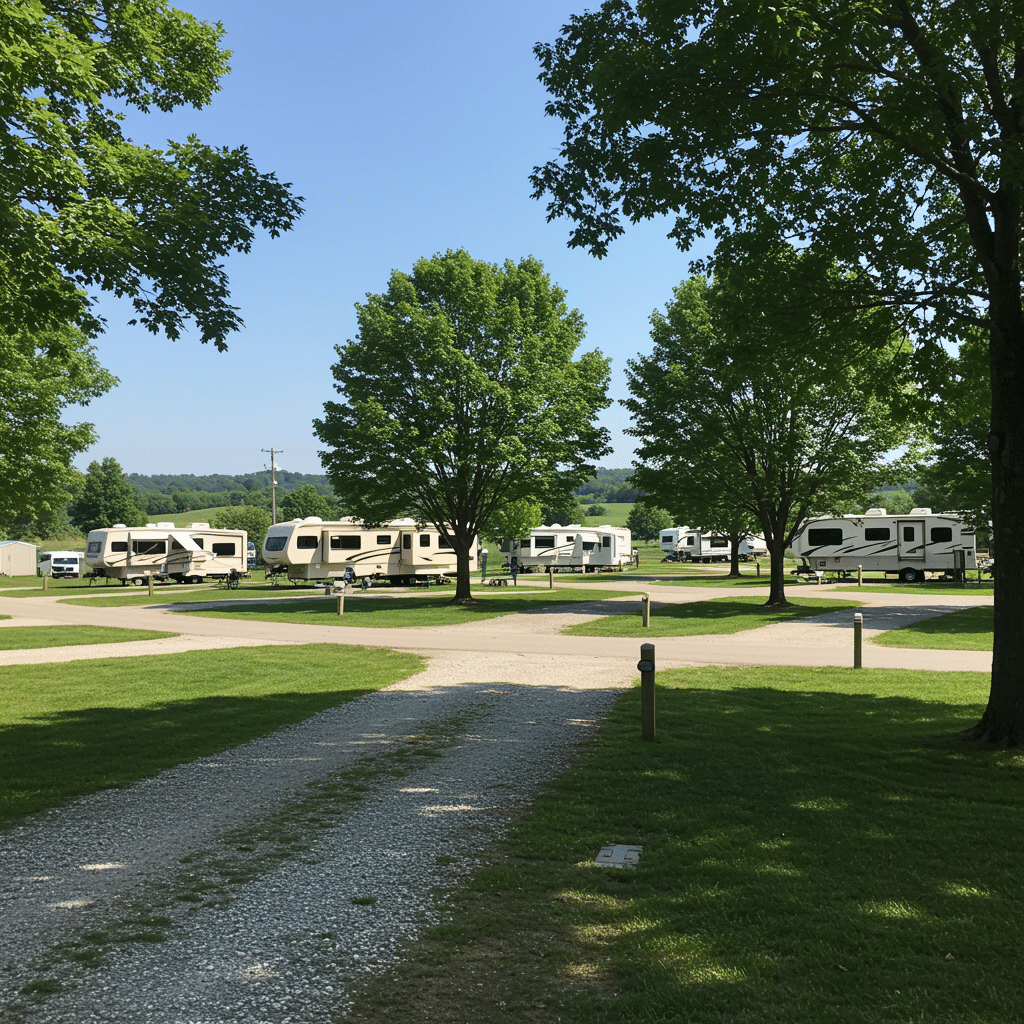Modern RV campsites with full hookups, water and electric services, and well-maintained surroundings at 7414 Old State Road 25 N Lafayette IN, featuring parked RVs, gravel pads, and green natural landscaping.
